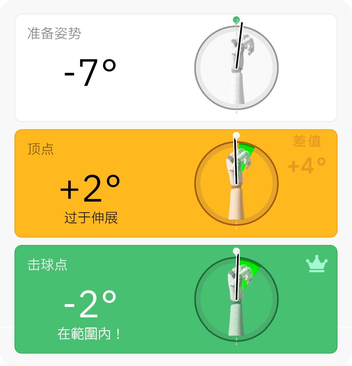 以直观的色彩区分评估结果: ● 绿色: 动作在理想范围内。 ● 黄色: 表示有优化空间。 清晰指出可优化领域,辅助您更快地取得进步。
